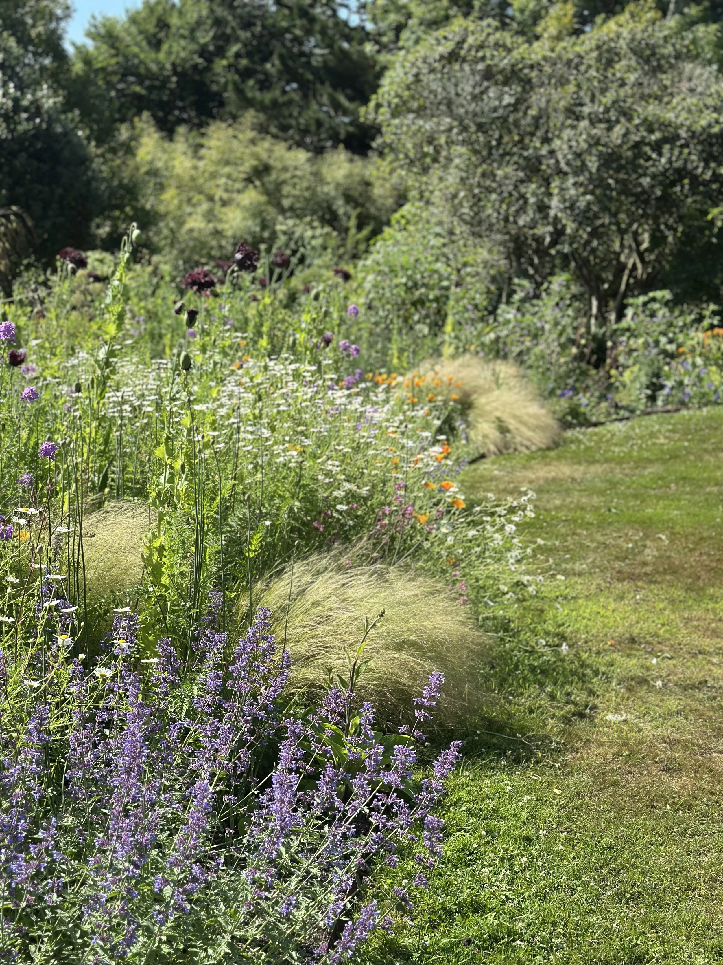 Starting from the bottom up we have given the stream fed pond attention and above we have dug out a bed, brought in tonnes of compost by hand and have now replanted in a more natural, ecologically conscious and native planting scheme which will give year round interest with shapes and structures as well as colours, yet need less maintenance and watering once established.