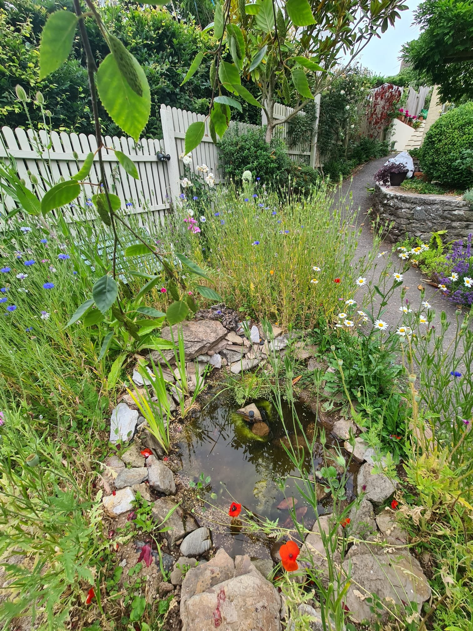 The pond is deep enough to dangle your legs over the side on a hot summers day but has a shallow ramp for access and egress on the opposite side for any mammals needing a water source. It was teeming with water boatmen two days after it was dug, birds and bees are often seen drinking from the pebbles in its shallows!
