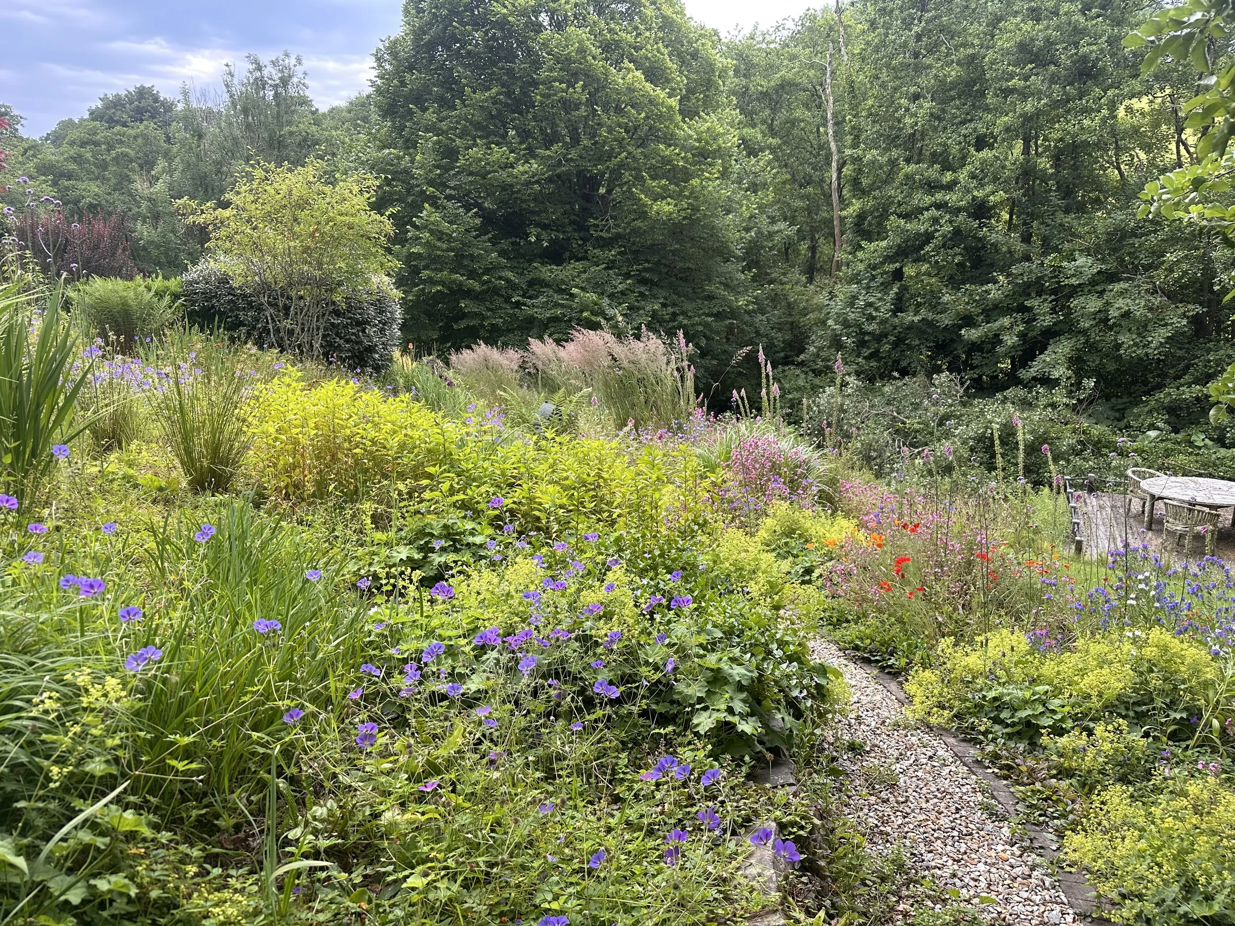 This riverside Rectory is now a family home with a terraced garden facing the river. The garden offers a beautiful balance of wild flowers, pollinator friendly and ornamental perennials and shrubs.